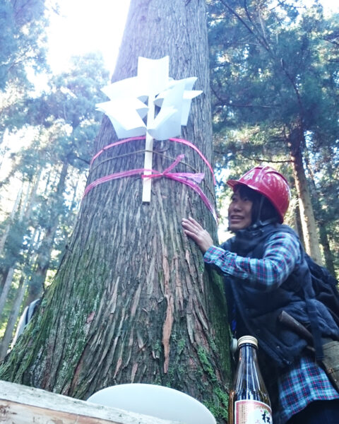 S様夫妻が参加している山を楽しむサークル「やまめの会」とタイアップして、越前市内の山の木の伐採ツアーを行いました。伐採・葉がらし・製材・乾燥・職人の手刻み加工という工程を、山を愛する仲間とともに見学し、楽しみながら家づくりを行いました。